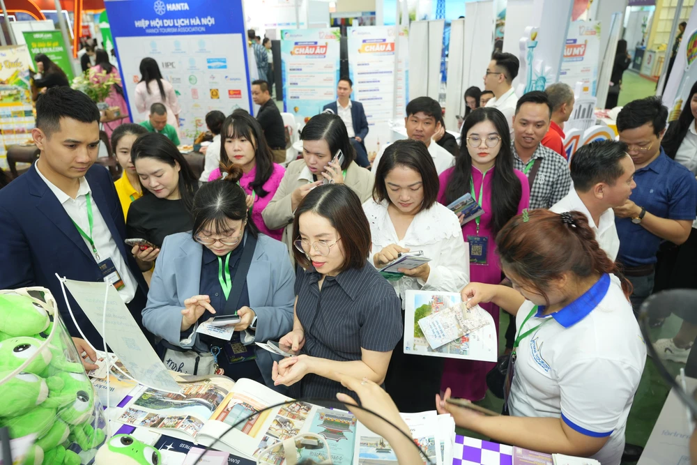 Các đại biểu tham quan gian hàng của Tổng cục Du lịch Hàn Quốc tại Việt Nam trưng bày trong khuôn khổ Hội chợ Du lịch Quốc tế VITM Hà Nội 2025
